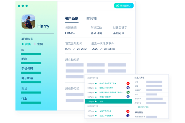 对全渠道客户数据进行清洗、合并,构建客户全景视图;通过标签、线索分值,进行客户全生命周期的洞察管理,让企业及时发现商机,引导转化